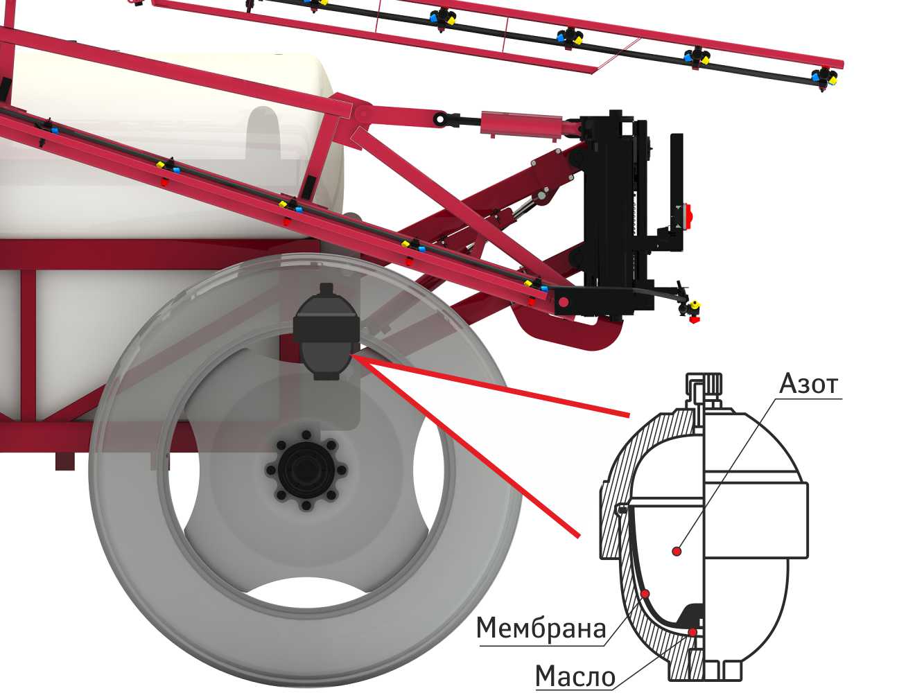 | Надежная система гашения вертикальных колебаний В опрыскивателях Satellite применено надежное решение для гашения вертикальных колебаний – пневмогидроаккумуляторы (с закачанным под давлением азотом) – которые исключают раскачивание штанги и требуют минимального обслуживания. |